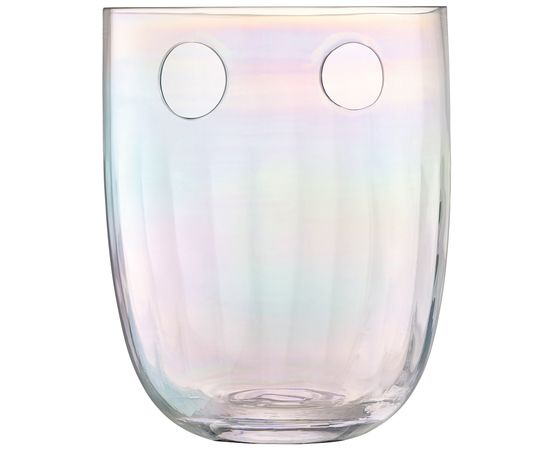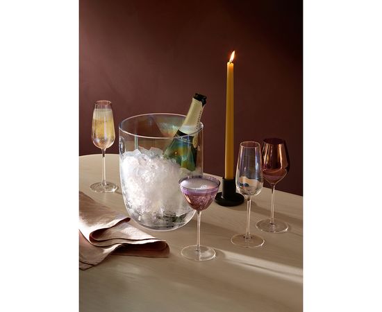 Набор включает два бокала и ведерко для льда из выдувного стекла. Изделия покрыты перламутровым блеском вручную. Рифленая поверхность создает неповторимую игру света. Ножки бокалов вытягиваются, пока стекло еще пластичное. Основания накладываются вручную с помощью деревянных инструментов. Ободок ведерка обрезается и полируется для получения ровной, гладкой кромки. Объем каждого бокала: 250 мл.