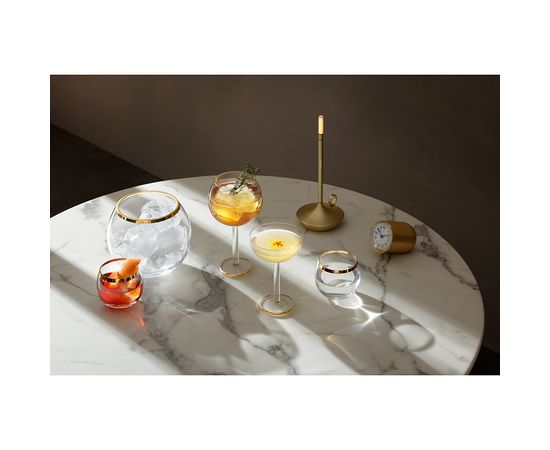 Изделие выполнено из высококачественного выдувного стекла. Роспись в виде золотого ободка нанесена вручную. Высота: 15 см.